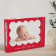 Simple and modern birth announcement photo block featuring your baby's photo nestled inside of a red scalloped frame. Personalize the photo block by adding your baby's name and additional information in white lettering.