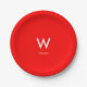 Trendy personal party paper plates featuring red background, large centred monogram and associated name. Clean, simple minimalist typography. Fully personalizable.