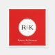 This simple and modern wedding napkin features a white circle with the monogram of the bride and groom on a red background. Customizable text, near the bottom, features the names of the bride and groom and their wedding date.