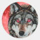 An acrylic painting of a grey wolf with glowing red eyes in front of a red moon.