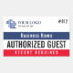 Visitor pass sticker with a simple design in black, white, navy blue, and red. Authorized guest is written across the guest sticker, but you can change the wording to suit your needs. Personalize further with your business logo and the name of the company.