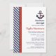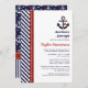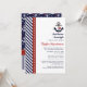 Red and navy blue anchor bridal shower invitations with a nautical theme. Navy and white striped border with a printed red and white stitched ribbon look design and an anchor with a star and red heart hanging off of a rope. This cute and preppy design is perfect for an ocean or beach themed spring or summer wedding shower. Customize the front and back of this card to say whatever you want. Artwork © Chrissy H. Studios, LLC. All Rights Reserved.