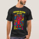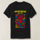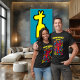 This radiant red neon alien with playful antennas and a wide pink smile beams with quirky energy. Surrounded by colourful abstract symbols on black, it’s a funky pop art design perfect for festivals, streetwear, or anyone who loves bold and cheerful statement t-shirts.