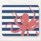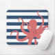 This trendy modern beach style mouse pad contains a red octopus against a white and navy blue striped background.