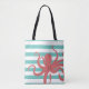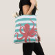 This trendy modern beach style tote bag contains a red octopus against a white and teal striped background.