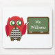 A mousepad for teachers featuring an illustration of a red owl standing at a chalkboard. Owl has a black chevron belly. Personalize with your name on chalkboard. Look for matching items at The Pink Schoolhouse.