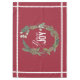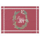 Cette jolie nappe de vacances dispose d'un arrière - plan rouge canneberge que vous pouvez changer à n'importe quelle couleur que vous voulez facilement avant de commander! Agréable à table toute la saison, le centre a des cônes de pin et des branches à feuillage persistant couronnes avec le texte blanc qui lit Peace & Joy. Un cadre design en rack blanc entoure la nappe sur les quatre côtés.