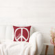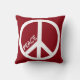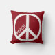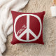 A red pillow with a large white peace sign and customizable text. Keep the word peace or add a name instead!