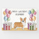 Destei's original cartoon illustration of a red and white coat colour Pembroke Welsh Corgi breed dog. The dog is placed in a colourful birthday setting with pastel colour birthday balloons and presents. The pastel colours include pink, green, blue, red, orange and purple. The dog is standing on a yellow wood floor texture and the background has a playful pastel colour polka dot pattern. There is also a personalizable text area.