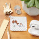 Destei's original cartoon illustration of a cute long hair red piebald coat colour Dachshund breed dog. There is also a personalizable text area for a name on the other side. The background has a pattern of grey dog paw prints.