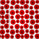 This fabric has a mid-century modern design of red pinwheels made with red circles and black "spokes" on a white background.