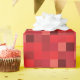 This wrapping paper features squares in different shades of red in a pixelated pattern.