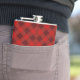 Red plaid hip flask with a metal cap, featuring a classic tartan pattern. The design conveys a cozy, rustic feel suitable for a traditional setting.