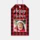 These fun holiday gift tags feature a square photo template, red and black buffalo check plaid, and stylish typography.