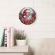 This vibrant Christmas clock features a jolly Santa Claus with a full white beard and traditional red suit, set against a large full moon and a snowy, starry night. He is surrounded by a rich border of red plaid, pine sprigs, poinsettias, and pinecones. The image is highly decorative and festive, incorporating traditional holiday elements with a detailed, three-dimensional style. The design may look real due to the high detail and three-dimensional texture in the artwork.