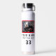 Red Player Name Number Team Photo Water Bottle. Personalize it with player photo, name, team name, player number and year. The text is trendy bold grey with red stripes. A perfect gift for a sports player, teammate or coach.