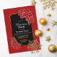 A gold and red bordered black Christmas party invitation featuring vibrant faux red and white poinsettias. Suitable for family and business Christmas celebrations.