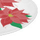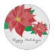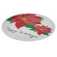 This round decorative glass cutting board features a graphic of two red poinsettias and the customizable text: Happy Holidays.