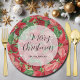 Personalized paper plates feature modern, elegant red poinsettias with Merry Christmas and your name in chic lettering. MATCHING items in our collection.