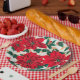 Featuring a faux fabric print with vibrant red poinsettias, holly leaves and red berries design on ivory background, our beautiful festive paper plate is the perfect addition to your for your holiday party decoration.