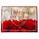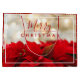 A large gift bag with a festive holiday photograph featuring a bouquet of red poinsettias along the bottom. Shimmering golden bokeh lights in the background. Classy sophisticated style. Merry Christmas typography written in a trendy red font. Gold snowflakes pattern background on a dark red colour.
