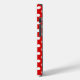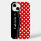 Stylish iPhone case designed with a white polka dots over red pattern, a black frame over the left side, and personalized with your name or custom text in white across the black frame. This design is perfect for vertical and horizontal use of the mobile phone.
