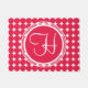 Red dots in close quarters create a secondary pattern of white stars. A large red circle is surrounded by white lines, while a single white initial graces the centre.