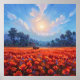 A large field of red poppies with a blazing sun. Bathed in golden light. Featuring a quaint building and truck in the landscape, this artwork is a celebration of natural beauty and peaceful moments. The scene features a rustic building and a classic truck nestled among rolling hills and distant trees. The bright blue sky with soft clouds adds to the feeling of peace and tranquillity. This piece is perfect for bringing a touch of natural beauty and serene light into any room. This artwork can be customized, printed, and or downloaded.