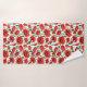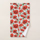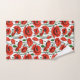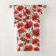 Towel set in a delicate pattern of vibrant red poppies with deep green stems and leaves, on a while background, with, each poppy bloom uniquely curved and twisted, as if swaying gently in the breeze.