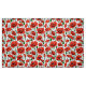 Fabric in a delicate pattern of vibrant red poppies with deep green stems and leaves, on a while background, with, each poppy bloom uniquely curved and twisted, as if swaying gently in the breeze.
