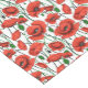 Table runner in a delicate pattern of vibrant red poppies with deep green stems and leaves, on a while background, with, each poppy bloom uniquely curved and twisted, as if swaying gently in the breeze.