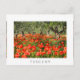 Photo postcard of a field with red poppy flowers under old olive trees in an orchard in the countryside of Italy in summer with a white border and the text 'Tuscany'.
