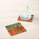 Coaster with a photo of a field with red poppy flowers under old olive trees in an orchard in the countryside of Italy in summer.