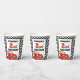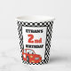 Red race car on black and white chequered flag child's 2nd birthday party paper cups. Personalize with the name and age of the guest of honour. Contact me for assistance with your customizations or to request additional matching or coordinating Zazzle products for your party.