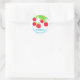 A cheerful sticker decorated with five ripe raspberries illustrated with watercolor on a white background accented with bright blue text. Great for jar labels for your berry preserves to sell or give as gifts!