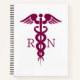 A spiral notebook with a stylish red cadaceus symbol with the letters R N on either side. Simple minimalist design.
