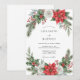 This botanical design captures the spirit of the holiday season with vibrant red poinsettias and elegant white roses. Nestled among the blooms are textured evergreen pine branches, holly leaves, and clusters of red berries. The watercolor artwork creates a sophisticated and festive atmosphere for a seasonal event. A classic palette of scarlet, emerald green, and snowy white defines this masterpiece.