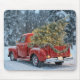 A vintage red truck is parked in a snowy landscape, carrying a Christmas tree adorned with glowing lights in its bed