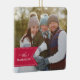 Cute double-sided photo ornament features a favourite photo on each side, adorned with a red and white ribbon banner. Personalize the front with your family name, and add the year to the back.