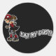 An awesome cartoon Roller Derby girl wearing red, black and white playing the Jammer postion and the phrase "Eat my dust!" Here quadskates have pink wheels.