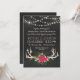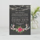 A rustic chalkboard wedding invitation featuring hand-drawn deer antlers decorated with flowers, such as roses, clovers, and baby's breath, and greenery, such as fern and other leaves. Between the floral antlers and rows of shining string lights, you can customize the wedding invitation text, which is written in pretty chalkboard fitting fonts.