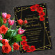 Gold and black birthday invitation with vibrant traditional red roses and classic script typography