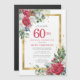 Beautiful red and white roses are nestled in holly and eucalyptus leaves to create an elegant floral display. They decorate a wide gold frame and are dappled with gold confetti dust. 60th birthday celebration and the person's name is written in a large red text. All of the text can be edited. Perfect choice for a special winter birthday celebration.