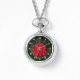 A photograph of a red rose in a garden. The blossom is fully open exposing the yellow stems of the centre. A pair of red buds are growing behind the main flower. The background is full of green leaves. There is a white hours and minutes clock-face for this flower picture. Image Copyright ©Kimberly J Tilley.