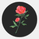 traditional watercolor floral artwork of a red rose with green leaves and stems on a black sticker