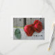 A wedding rsvp featuring a photo on front of two red roses over a background of barnwood.