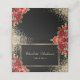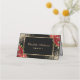 Elegant black and gold floral table card or place card featuring red roses framing the guest name and table number inside a gold frame against a black background adorned with gold confetti.