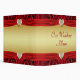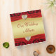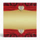 Gorgeous red roses in a gold trimmed vase on a golden background with a faux satin red ribbon, topped with 2 golden hearts with faux diamond embellishments. Perfect for a romantic wedding or anniversary.