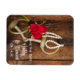 Set the tone for your upcoming rural farm or western ranch theme nuptials with the charming Red Roses and Horse Bit Country Wedding Save the Date Flexible Magnet. This rustic chic custom equine theme marriage keep the date magnet features a quaint digitally enhanced floral photograph of red rose flower blossoms, pearl necklace, horse bit and leather reins with a brown weathered barn wood background.