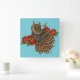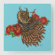 A beautiful brown owl with red roses and butterflies in a backdrop of blue
